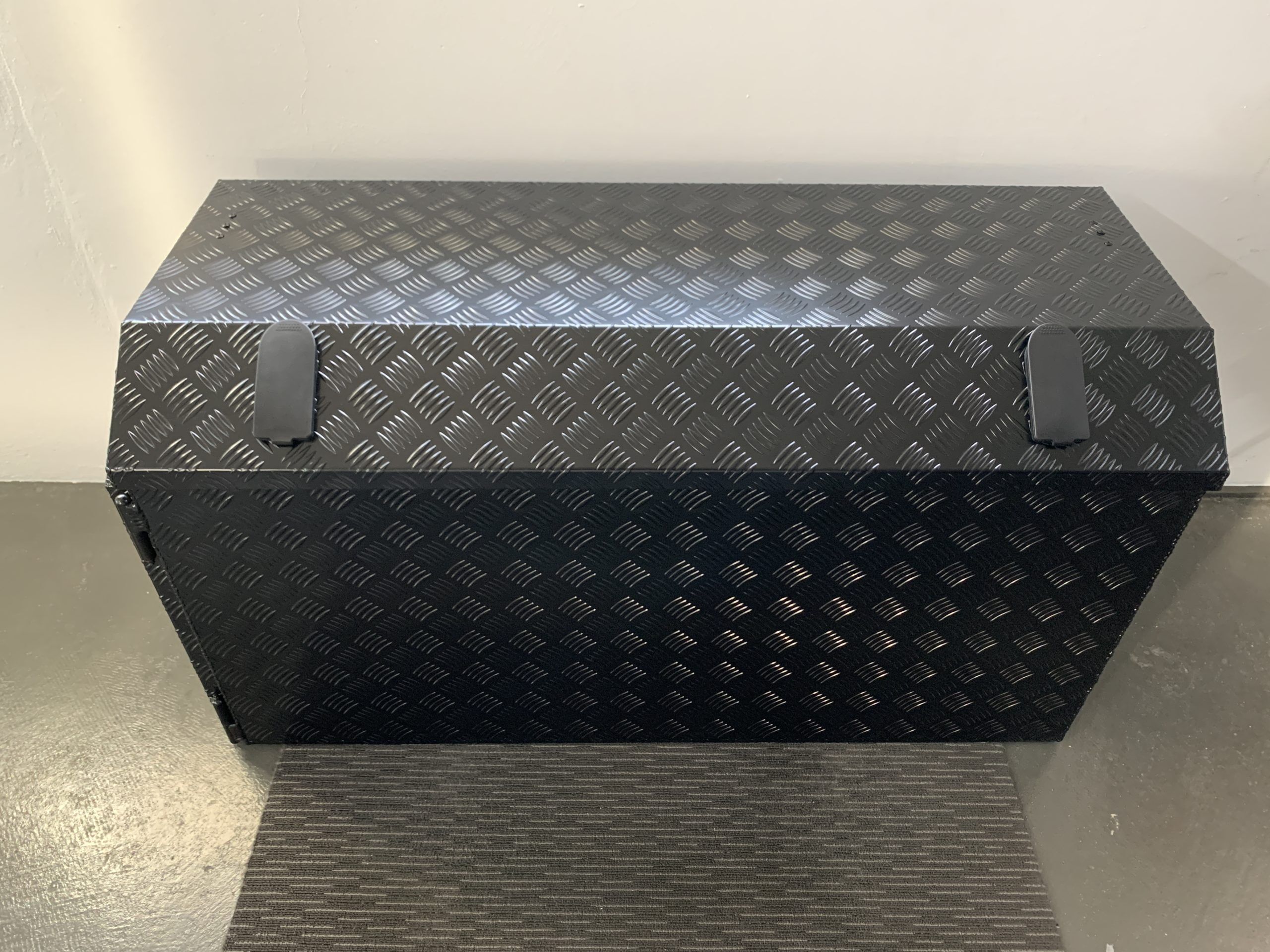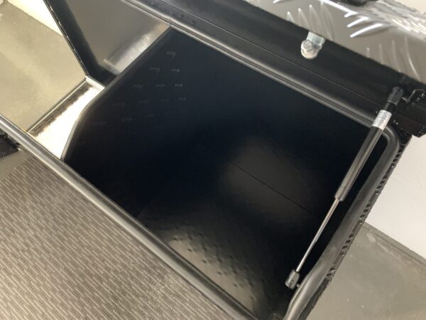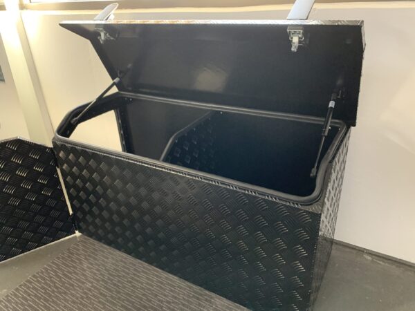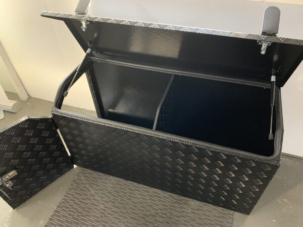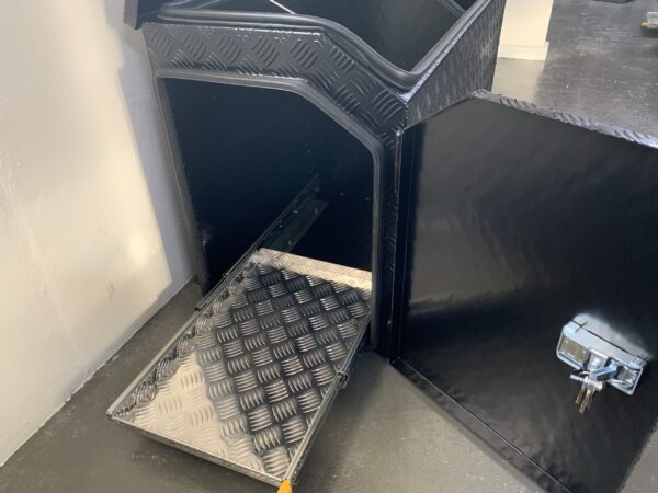 The tool box is manufactured in Australia out of ALUMINIUM checker plate. It has a heavy duty slide-out drawer installed on the left side. The slide-out drawer is suitable for generators, BBQ’s and much more. You have accessibility on BOTH sides via the lockable door at the top of the box. all doors have rubber seals running around the edges to prevent anything from making its way into your beloved tool box.
